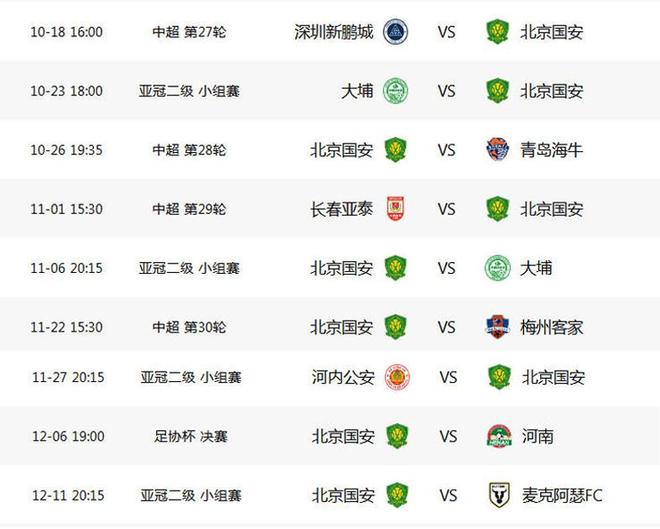 國安接下來回聯(lián)賽扮演“生死判官”!10月18日聯(lián)賽第27輪,客戰(zhàn)深圳新鵬城,10月23日亞冠二級第三輪客戰(zhàn)大埔,10月26日聯(lián)賽第28輪,主場迎戰(zhàn)青島海牛,11月1日第29輪客戰(zhàn)長春亞泰,11月6日,亞冠二級第四輪,主場和大埔進行背靠背比賽,11月22日聯(lián)賽末輪,主場迎戰(zhàn)梅州客家。