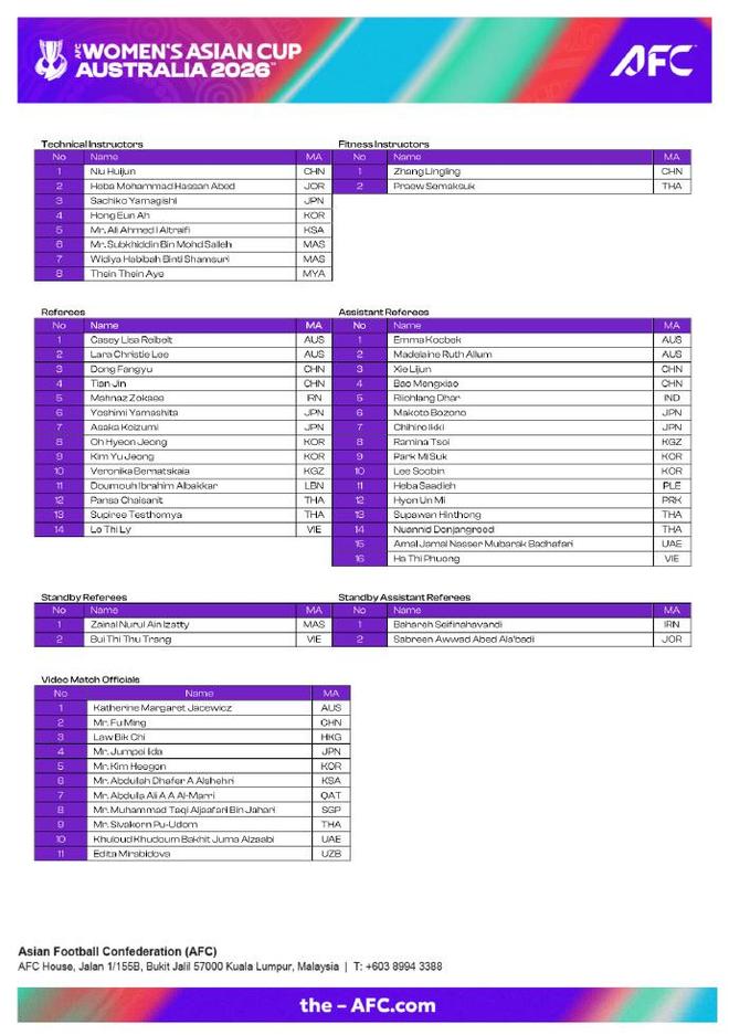 10月8日,亞足聯(lián)公布了2026年女足亞洲杯裁判名單,中國共7人入選,其中主裁判為董方雨、田金,助理裁判包括謝麗君、鮑夢曉,視頻賽事官員傅明,此外,?;菥羌夹g指導,張玲玲為體能指導。